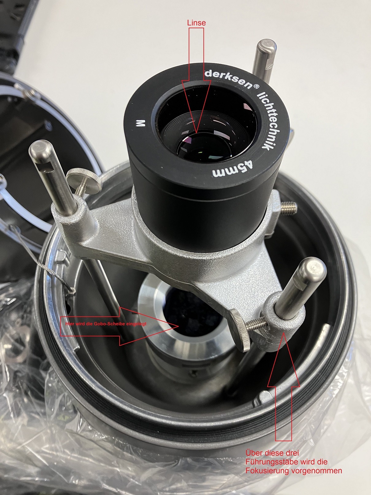 Und dann gibt es noch „Gobos“. Dieses Kürzel steht für Graphical Optical Blackout – das sind Schablonen, ähnlich wie Dias. Man setzt sie vor Lichtquelle, damit das Licht ein bestimmtes Bild erzeugt, ein Muster, Logo oder auch einen Text. Sowas nutzt man in Theatern und Museen, nun auch im öffentlichen Raum. Gobo-Lampen funktionieren ähnlich wie Dia-Projektoren, man nennt sie auch Architektur-Projektoren. Von den Masten herunter liefern sie Bilder und Effekte. Die Dias dafür werden gelasert. Sie müssen perfekt in die Lampen eingelegt werden, damit es am Boden später genau den gewünschten Effekt hat.