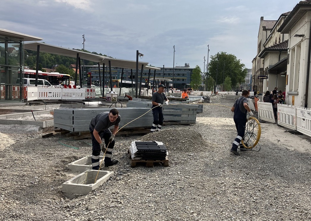 Als Fabian die Pläne zum ersten Mal in die Hand bekam, hat es ihn überrascht, wie detailreich und feingliedrig vogtpartner alles geplant hatte. Und wie viele verschiedene technische Lösungen vorgesehen waren: Es gibt Beleuchtung für die Fläche, für Haltesteige und Wartehäuschen. Es gibt Lichtpfeile und Lichtkorridore, um Passanten zu lenken. Man kann die Beleuchtung auch variieren, beispielsweise für Events.